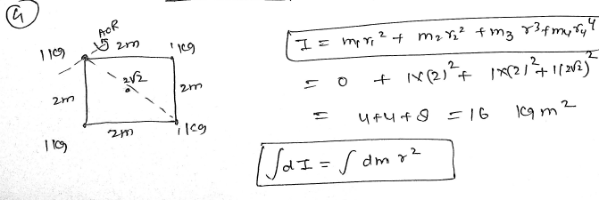 Four objects of mass 1 kg are placed at the vertices of a square of side 2 m, an axis passing perpendicular to the plane of the square through one of the vertices then calculate the moment of inertia about this axis ? JEE 2024