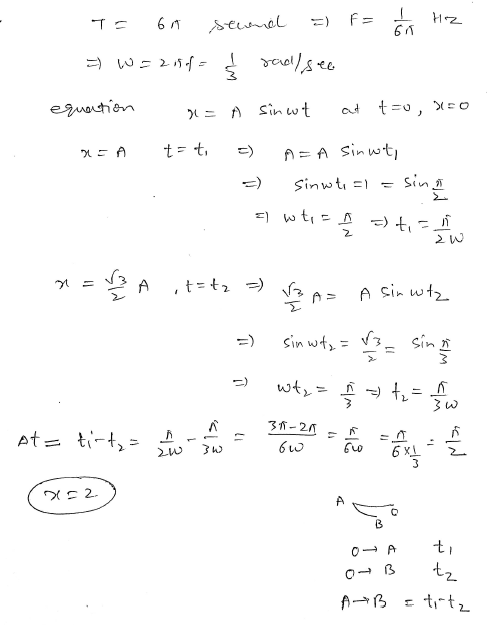 A simple harmonic oscillator has an amplitude A and time period 6pi second. Assuming the oscillation starts from its mean position, the time required by it to travel from x = A to (A/2) square root 3 will be pi / x second, where x =